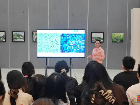 在互动交流环节,有学生提出“综合材料语言能为视觉传达设计提供怎样的设计思路”这一问题。曹原老师指出,材料本身可作为独立语言传递设计意图,突破传统绘画媒介的限制。她认为应整合设计学、材料学、社会学等多学科视角,运用不同材料能引发观者对环保、消费主义等社会问题的思考。例如,用废旧物品创作可强化作品的现实意义,使设计不仅具备视觉冲击力,还能引发情感与价值观的共鸣。同时,可融合传统工艺与数字技术,打破二维与三维的创作界限,实现跨维度表达,并结合装置艺术、材料拼贴、综合造型等形式,利用创新材料(如废旧金属、塑料、布料等)探索设计新可能。