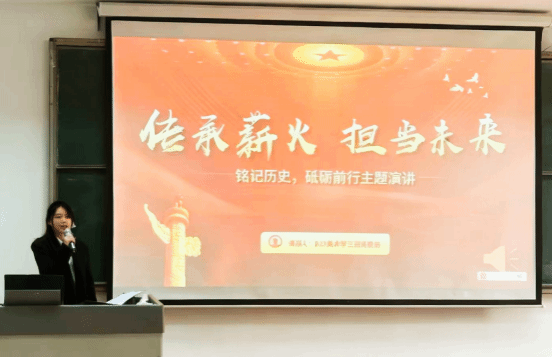 活动尾声,美术学院党总支副书记田艳艳作总结发言。她寄语同学们,要以历史为脉络,深刻领悟铭记峥嵘,以青年为己任,以史为鉴,将满腔爱国热忱化作笔下丹青、脚下征程,用青春韶华书写属于新时代的奋进答卷。