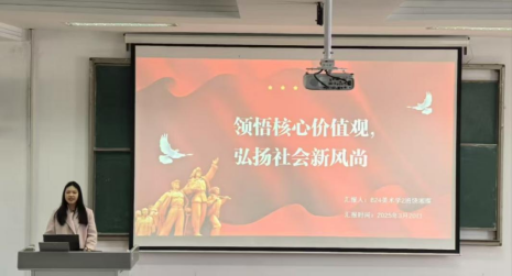 为引导同学们深刻领悟核心价值观,弘扬社会时代新风尚,营造与时俱进、积极向上的优良学习环境。3月20日中午,美术学院学生会学习发展部在西校区崇仁楼二楼阶梯教室组织2024级全体学生,开展了“领悟核心价值观,弘扬社会新风尚。”主题政治学习会议。本次会议由B24美术学二班团支书饶湘璨主持。